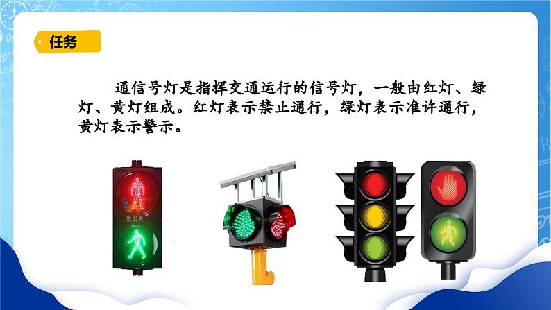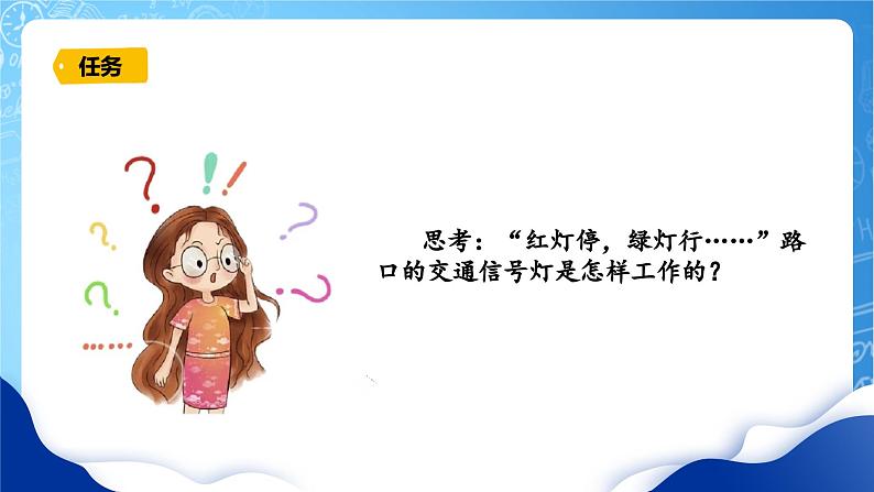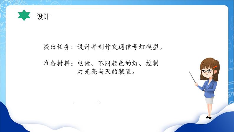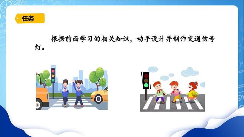 提出任务:设计并制作交通信号灯模型。准备材料:电源、不同颜色的灯、控制 灯光亮与灭的装置。