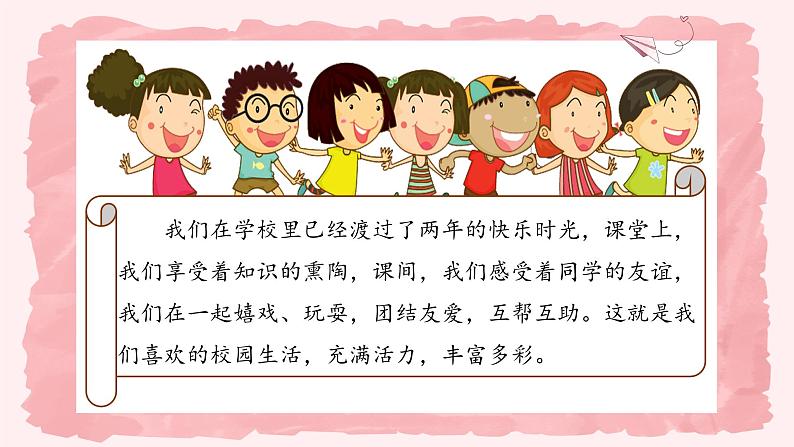 我们在学校里已经渡过了两年的快乐时光,课堂上,我们享受着知识的熏陶,课间,我们感受着同学的友谊,我们在一起嬉戏、玩耍,团结友爱,互帮互助。这就是我们喜欢的校园生活,充满活力,丰富多彩。