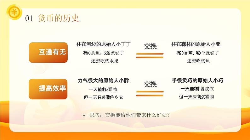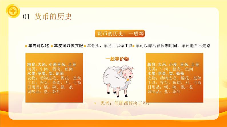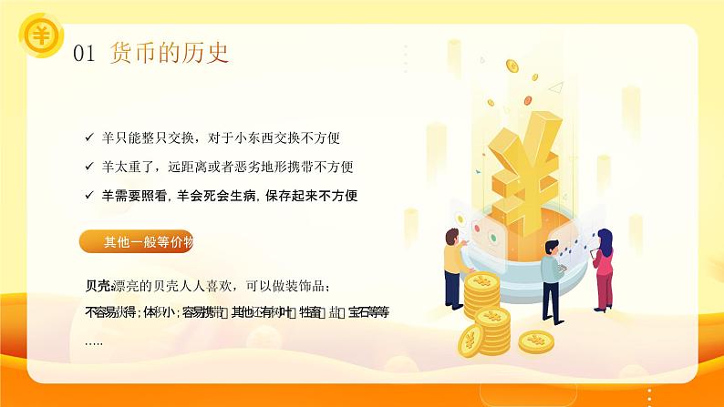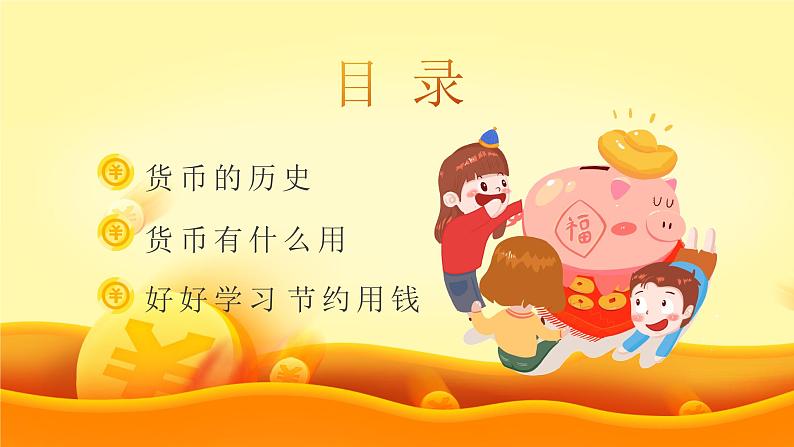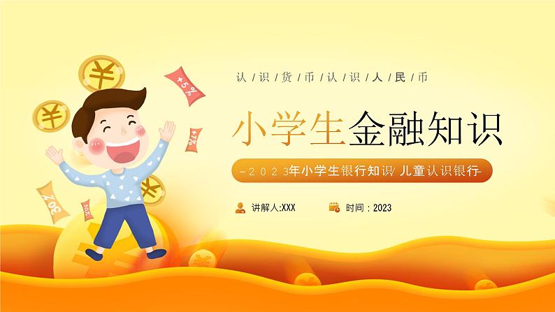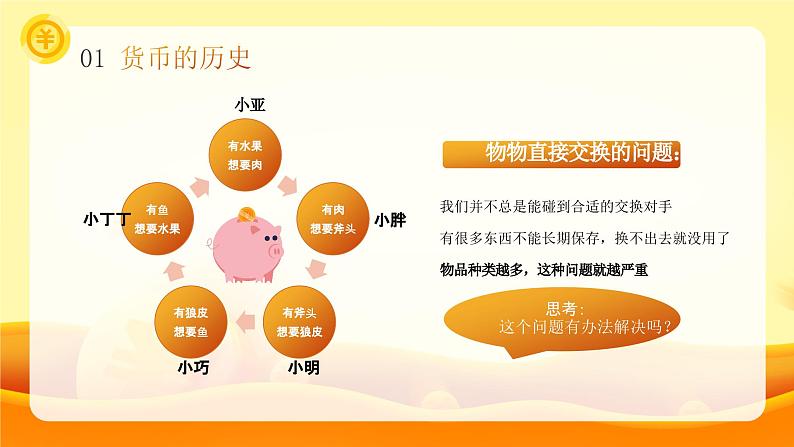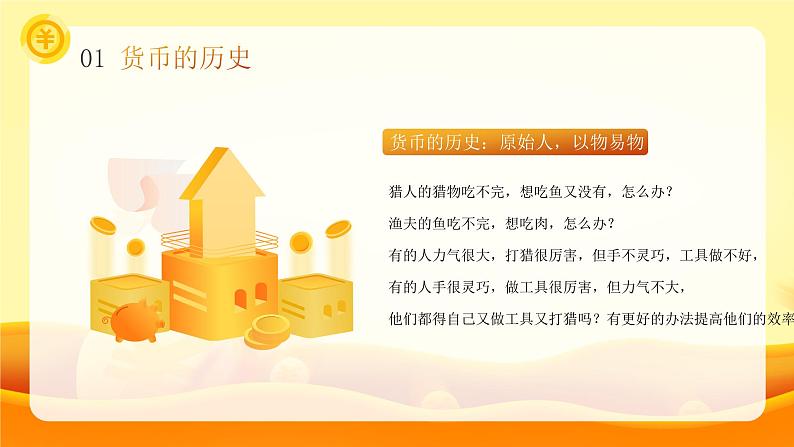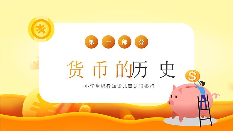 这是一份黄色卡通风小学生金融知识PPT模板,共17页。PPT课件主要包含了货币的历史,互通有无,物物直接交换的问题,货币有什么用,好好学习节约用钱等内容,欢迎下载使用。