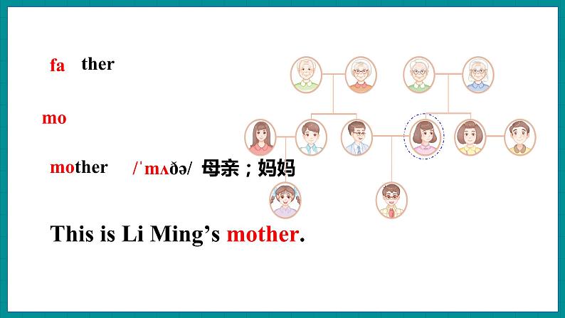 这是一份小学英语冀教版 (三年级起点)五年级上册Lesson 1 Li Ming's Big Family公开课课件ppt,共27页。PPT课件主要包含了 New words,father,父亲 爸爸,mother,母亲 妈妈,parents ,parent,外祖父,外祖母,brother 等内容,欢迎下载使用。