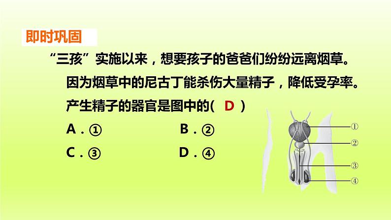 “三孩”实施以来,想要孩子的爸爸们纷纷远离烟草。因为烟草中的尼古丁能杀伤大量精子,降低受孕率。产生精子的器官是图中的( )A.① B.② C.③ D.④