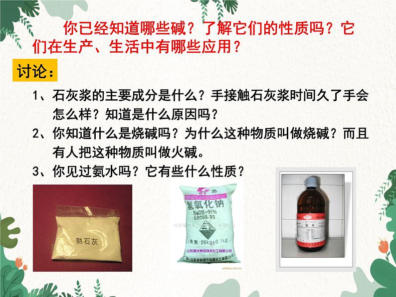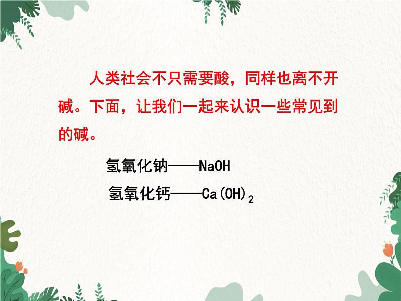化学九年级下册 RJ 第 十 单元 酸和碱课题1 常见的酸和碱第1课时 常见的碱在我们的周围,存在着许多含有碱的物质。新课导入 你已经知道哪些碱?了解它们的性质吗?它们在生产、生活中有哪些应用?讨论:1、石灰浆的主要成分是什么?手接触石灰浆时间久了手会 怎么样?知道是什么原因吗? 2、你知道什么是烧碱吗?为什么这种物质叫做烧碱?而且 有人把这种物质叫做火碱。3、你见过氨水吗?它有些什么性质? 人类社会不只需要酸,同样也离不开碱。下面,让我们一起来认识一些常见到的碱。氢氧化钠——NaOH氢氧化钙——Ca(OH)21.几种常见的碱(1)氢氧化钠 氢氧化钠俗名:苛性钠、火碱或烧碱。获取新知实验10-5用镊子夹取一小块氢氧化钠分别进行实验点击播放实验视频 吸收空气中的水分,表面潮湿并逐渐溶解,这种现象叫做潮解。白色固体 氢氧化钠极易溶于水,溶液温度明显升高 氢氧化钠和浓硫酸都能吸水,所以它们都可用作一些气体的干燥剂。 注意:由于氢氧化钠是碱,不能用作酸性气体的干燥剂,如CO2、SO2;浓硫酸是酸,不能用作碱性气体的干燥剂,如NH3。它们都可用作H2、O2和CH4的干燥剂。 取一小钥匙氢氧化钙,观察它的颜色和状态,然后放入小烧杯中,加入约30mL水,用玻璃棒搅拌,观察氢氧化钙在水中的溶解情况。然后放置,使上层澄清。向澄清的石灰水中通入少量二氧化碳,观察现象。实验10-6(2)氢氧化钙 俗称:熟石灰或消石灰。注意白色粉末不易(微溶)石灰水变浑浊 氢氧化钙对皮肤、衣服等有腐蚀作用,使用时应小心。 氢氧化钙的水溶液俗称石灰水。当石灰水中存在较多未溶解的熟石灰时,就称为石灰乳或石灰浆。 熟石灰可由生石灰(CaO)与水反应得到:CaO+H2O=Ca(OH)2 除了氢氧化钠和氢氧化钙外,常见的碱还有氢氧化钾(KOH)、氨水(NH3·H2O)等。2.碱的化学性质碱的化学性质探究(1)你还记得紫色石蕊溶液和无色酚酞溶液遇到氢氧化钠和氢氧化钙溶液显示什么颜色吗? 紫色石蕊溶液遇到氢氧化钠溶液和氢氧化钙溶液都显示蓝色;无色酚酞溶液遇到氢氧化钠溶液和氢氧化钙溶液显示红色。(2)①回忆检验二氧化碳的反应,写出化学方程式: 。氢氧化钙能与空气中的 二氧化碳反应,生成坚硬的碳酸钙。前面提到的用熟 石灰与沙子混合来砌砖,用石灰浆刷墙壁等用途,都 是利用氢氧化钙的这一性质。CO2+Ca(OH)2=CaCO3↓+H2O②氢氧化钠在空气中不仅吸收水分,还能与空气中的二 氧化碳发生反应:2NaOH+CO2=Na2CO3+H2O,所以,氢 氧化钠必须密封保存。 上面两个反应有什么共同之处? 上面两个反应都生成盐和水 三氧化硫与碱反应与上面的两个反应类似,试写出 三氧化硫和二氧化硫与氢氧化钠反应的化学方程式: ; 。SO2+2NaOH=Na2SO3+H2O+6+6SO3+2NaOH=Na2SO4+H2O+4+4讨论CO2+Ca(OH)2=CaCO3↓+H2OCO2+2NaOH=Na2CO3↓+H2O+4+4+4+4生成相同价态的盐和水生成相同价态的盐和水硫酸钠亚硫酸钠 通过实验和讨论我们知道,盐酸、硫酸等酸由一些相似的化学性质,而氢氧化钠、氢氧化钙等碱也有一些相似的化学性质。这是为什么呢? 如右图所示,分别试验稀盐酸、稀硝酸、稀硫酸、氢氧化钠溶液氢氧化钡溶液的导电性。实验10-7点击播放视频碱溶液的导电性HCl = H++Cl-H2SO4=2H++SO42-NaOH = Na++OH-Ca(OH)2=Ca2++2OH- 通过研究和分析可知,不同的酸溶液中都含有H+,所以,酸有一些相似的性质。 不同的碱溶液中都含有OH-,所以,碱也有一些相似的性质。练习D中考C学完本课题你应该知道1.酸碱指示剂与酸溶液或碱溶液作用显示不同的颜色。例如,紫色石蕊溶液遇酸溶液变成红色,遇碱溶液变成蓝色无色酚酞溶液遇酸溶液不变色,遇碱溶液变成红色。2.酸有一些相似的化学性质。例如a.酸能使酸碱指示剂显示不同颜色b.酸能与多种活泼金属反应,生成盐和氢气c.酸能与某些金属氧化物反应,生成盐和水课堂小结3.碱有一些相似的化学性质,例如a.碱能使酸碱指示剂显示不同颜色b.碱能与某些非金属氧化物反应,生成盐和水4.酸溶液中都含有H+,碱溶液中都含有OH-。所以,酸和碱分别都有相似的化学性质。5.酸和碱有重要的用途。6.酸和碱都有腐蚀性,使用时一定要注意安全.学完本课题你应该知道制作“叶脉书签”点击播放视频课外实验1.填空题(1)生活中的一些物质中含有酸和碱,如食醋中含 有______,柠檬中含有______,除锈剂中含有________________;石灰水中含有 _________,炉具清洁剂中含有__________。(2)固体氢氧化钠曝露在空气中,容 易__________而使表面潮湿并逐渐溶解,这种现象叫做_________;同时吸收空气中的__________而变质,生成_________,因此,氢氧化钠固体必须______―保存。醋酸柠檬酸稀盐酸(稀硫酸)氢氧化钙氢氧化钠吸收水分潮解二氧化碳碳酸钠密封随堂练习2.选择题(1)厕所用清洁剂中含有盐酸,如果不慎洒到大理石地面上,会发出嘶嘶声,并有 气体产生。这种气体是( )。A. 二氧化硫 B. 二氧化碳 C.氢气 D.氧气(2)下列关于氢氧化钠的描述中错误的是( )。A.易溶于水,溶解时放出大量的热B.对皮肤有强烈的腐蚀作用C.水溶液能使石蕊溶液变红D.能去除油污,可作炉具清洁剂BC3.怎样鉴别石灰水和氢氧化纳溶液?答:分别取1~2mL未知液于试管中,向试管中通入CO2,出现白色沉淀的原溶液是石灰水,没有明显变化的原溶液是氢氧化钠溶液。4.在某些食品的包装袋内,有一个装有白色颗粒状固体 的小纸袋,上面写着“干燥剂,主要成分为生石灰”(如右图)。为什么生石灰能作干燥剂?