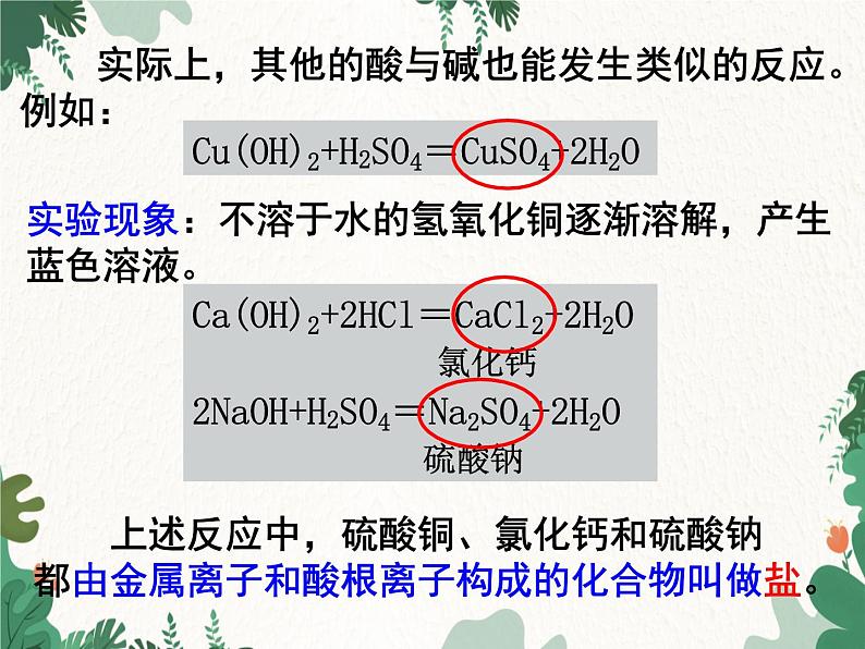 化学九年级下册 RJ 第 十 单元 酸和碱课题2 酸和碱的中和反应第1课时 中和反应 不同的酸溶液中都含有H+,所以,酸有一些相似的性质;不同的碱溶液中都含有OH-,所以,碱也有一些相似的性质。 那么,酸和碱能否发生反应呢?新课导入 如下图所示,在烧杯中加入约5mL稀氢氧化钠溶液,滴入几滴酚酞溶液。用滴管慢慢滴入稀盐酸,并不断搅拌溶液,至溶液颜色恰好变成无色为止。实验10-8一、中和反应探索新知观察实验10-8点击播放视频 原来,稀盐酸中的H+与氢氧化钠溶液里的OH-结合生成水分子。NaOH+HCl=NaCl+H2O硫酸也能发生类似的化学反应吗? 实际上,其他的酸与碱也能发生类似的反应。例如:Cu(OH)2+H2SO4=CuSO4+2H2O实验现象:不溶于水的氢氧化铜逐渐溶解,产生蓝色溶液。Ca(OH)2+2HCl=CaCl2+2H2O 氯化钙2NaOH+H2SO4=Na2SO4+2H2O 硫酸钠 上述反应中,硫酸铜、氯化钙和硫酸钠都由金属离子和酸根离子构成的化合物叫做盐。Cu(OH)2+H2SO4=CuSO4+2H2O 硫酸铜Ca(OH)2+2HCl=CaCl2+2H2O 氯化钙2NaOH+H2SO4=Na2SO4+2H2O 硫酸钠 像这些酸与碱作用生成盐和水的反应,叫做中和反应。酸酸酸碱碱碱下列方法可以解决生活中的一些问题:①服用含氢氧化铝[Al(OH)3]的药物可以治疗胃酸过多症,反应的化学方程式为:Al(OH)3+3HCl=AlCl3+3H2O (中和反应)②热水瓶用久后,瓶胆内壁常附着一层水垢[主要成分是CaCO3和Mg(OH)2],可以用 来洗涤。写出有关的化学方程式:CaCO3+2HCl=CaCl2+CO2↑+H2OMg(OH)2+2HCl=MgCl2+2H2O (中和反应)稀盐酸学以致用 在做酸碱中和反应的实验时,有时需借助指示剂颜色的变化来判断反应是否发生或完成。向含有无色酚酞的NaOH溶液的烧杯中,不断滴入稀盐酸。此过程烧杯中溶液颜色的变化是( )A.由红色变为蓝色B.由蓝色变为红色C.由红色变为无色D.由无色变为红色练习1.改变土壤酸碱性:根据土壤情况,可以利用中和反应,在土壤中加入酸性或碱性物质,调节土壤酸碱性,如在酸性土壤中可以加入熟石灰中和土壤酸性;二、中和反应在实际中的应用2.处理工厂废水:工厂生产过程中产生的废水需要进行一系列处理,如硫酸厂的废水可加入熟石灰中和;3.用于医疗:人胃液中含有适量盐酸,可以帮助消化,但盐酸若过量则反而造成胃病,在这种情况下,可以服用某些含碱性的药物如胃舒平中含Al(OH)3,可以中和过量的胃酸; 蚊虫及其它很多昆虫分泌的毒液蚊酸呈酸性,可以涂某些含碱性物质(如NH3·H2O)的药水,减轻痛痒。 中和反应在工农业生产和日常生活中有广泛的用途,下列应用一定与中和反应原理无关的是( )A.服用含Al(OH)3的药物治疗胃酸过量 B.使用熟石灰改良酸性土壤 C.用熟石灰和硫酸铜配制波尔多液 D.用氢氧化钠溶液洗涤石油产品中的残余硫酸练习思路提示:分析反应物是不是酸与碱的反应。C项中Ca(OH)2+CuSO4=CaSO4+Cu(OH)2↓,不属于中和反应。A、B、D项中都属于中和反应。C