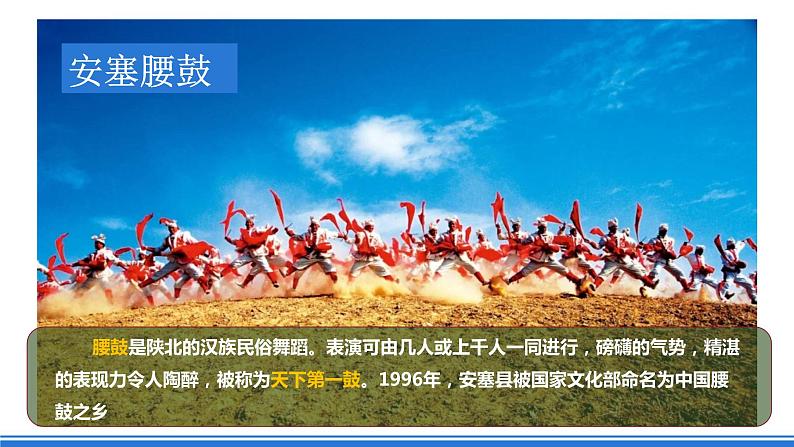 腰鼓是陕北的汉族民俗舞蹈。表演可由几人或上千人一同进行,磅礴的气势,精湛的表现力令人陶醉,被称为天下第一鼓。1996年,安塞县被国家文化部命名为中国腰鼓之乡