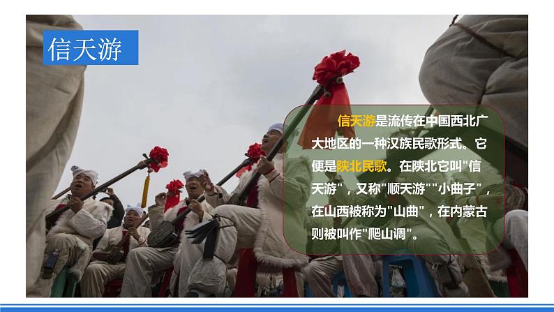 信天游是流传在中国西北广大地区的一种汉族民歌形式。它便是陕北民歌。在陕北它叫"信天游",又称"顺天游""小曲子", 在山西被称为"山曲",在内蒙古则被叫作"爬山调"。