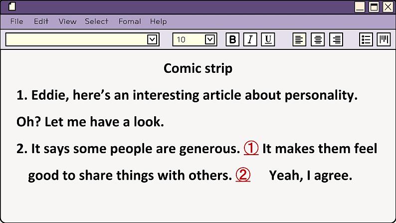 Cmic strip1. Eddie, here’s an interesting article abut persnality.Oh? Let me have a lk. 2. It says sme peple are generus. ① It makes them feel gd t share things with thers. ② Yeah, I agree.