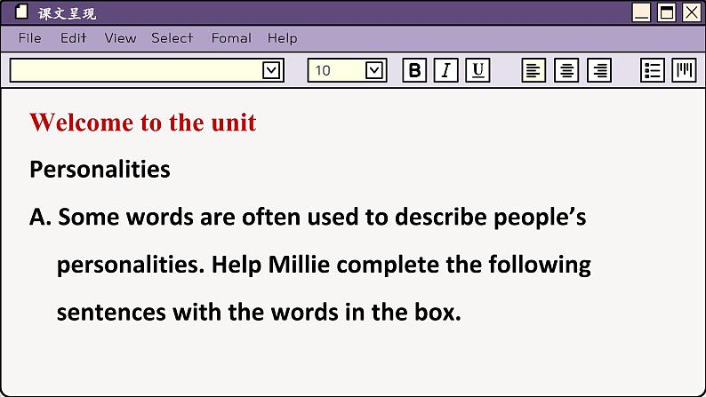 Welcme t the unitPersnalitiesA. Sme wrds are ften used t describe peple’s persnalities. Help Millie cmplete the fllwing sentences with the wrds in the bx.