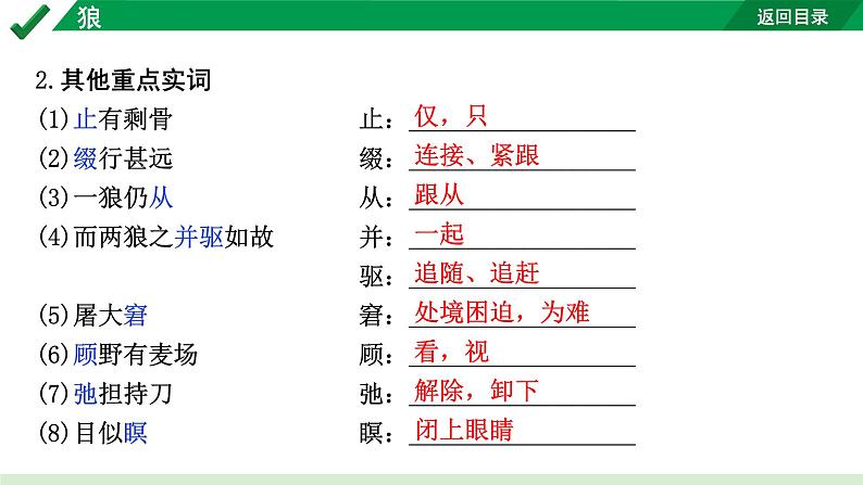 2.其他重点实词 (1)止有剩骨 止:__________________(2)缀行甚远 缀:__________________(3)一狼仍从 从:__________________(4)而两狼之并驱如故 并:__________________ 驱:__________________(5)屠大窘 窘:__________________(6)顾野有麦场 顾:__________________(7)弛担持刀 弛:__________________(8)目似瞑 瞑:__________________