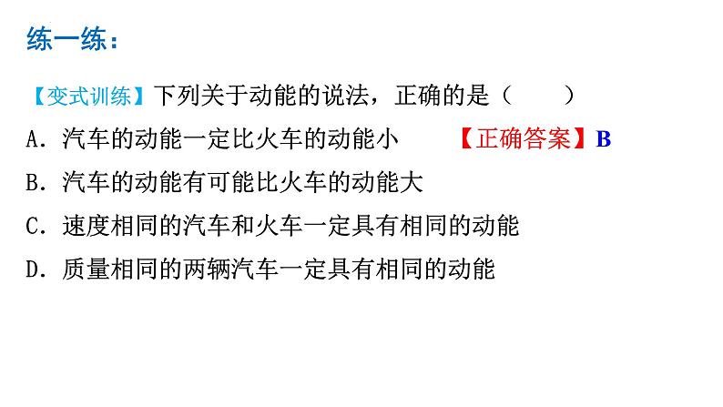 【变式训练】下列关于动能的说法,正确的是( )A.汽车的动能一定比火车的动能小B.汽车的动能有可能比火车的动能大C.速度相同的汽车和火车一定具有相同的动能D.质量相同的两辆汽车一定具有相同的动能