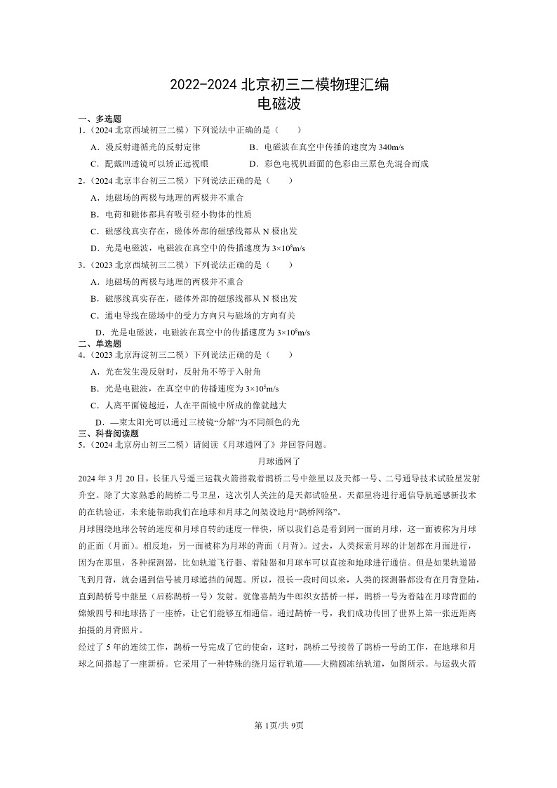 这是一份[物理][二模]2022~2024北京初三试题分类汇编:电磁波,共9页。