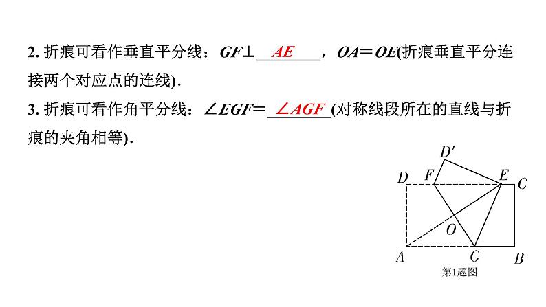 2. 折痕可看作垂直平分线:GF⊥________,OA=OE(折痕垂直平分连接两个对应点的连线).3. 折痕可看作角平分线:∠EGF=________(对称线段所在的直线与折痕的夹角相等).