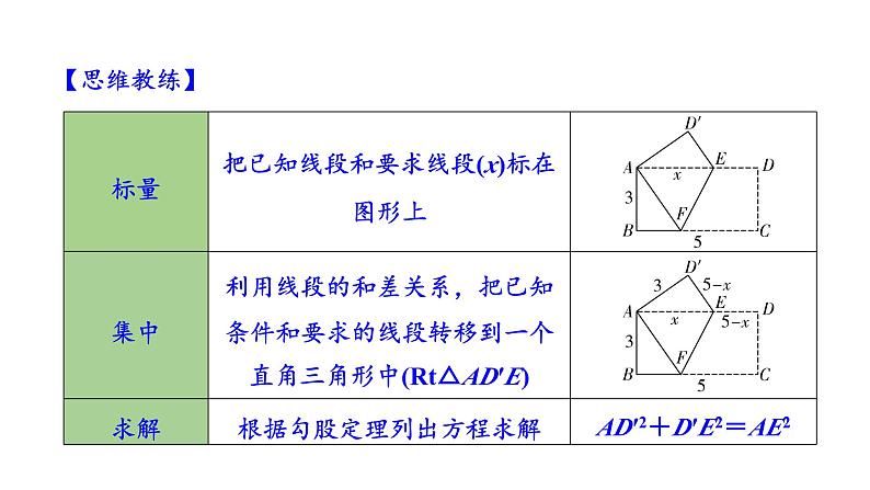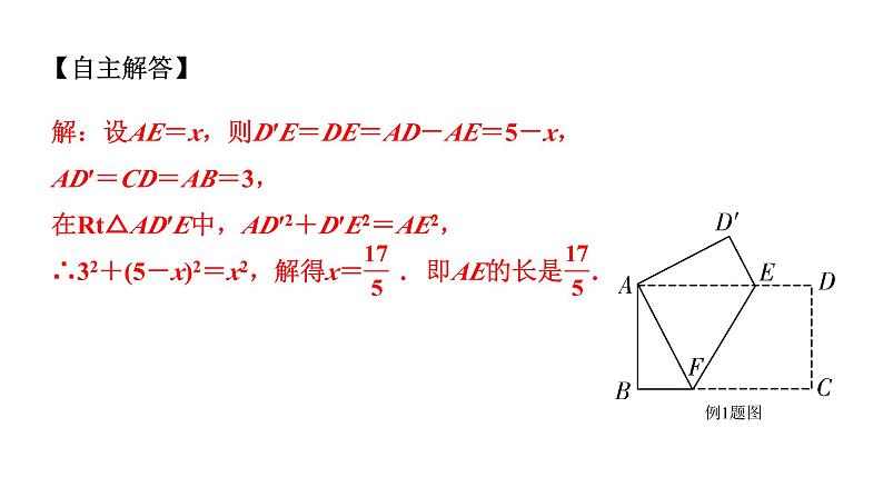 解:设AE=x,则D′E=DE=AD-AE=5-x,AD′=CD=AB=3,在Rt△AD′E中,AD′2+D′E2=AE2,∴32+(5-x)2=x2,解得x= . 即AE的长是 .