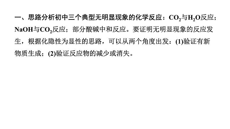 一、思路分析初中三个典型无明显现象的化学反应:CO2与H2O反应;NaOH与CO2反应;部分酸碱中和反应。要证明无明显现象的反应发生,根据化隐性为显性的思路,可以从两个角度出发:(1)验证有新物质生成;(2)验证反应物的减少或消失。
