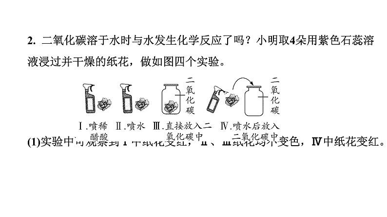 2. 二氧化碳溶于水时与水发生化学反应了吗?小明取4朵用紫色石蕊溶液浸过并干燥的纸花,做如图四个实验。(1)实验中可观察到Ⅰ中纸花变红,Ⅱ、Ⅲ纸花均不变色,Ⅳ中纸花变红。