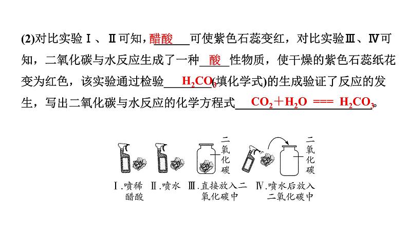 (2)对比实验Ⅰ、Ⅱ可知,______可使紫色石蕊变红,对比实验Ⅲ、Ⅳ可知,二氧化碳与水反应生成了一种_____性物质,使干燥的紫色石蕊纸花变为红色,该实验通过检验________(填化学式)的生成验证了反应的发生,写出二氧化碳与水反应的化学方程式_______________________。