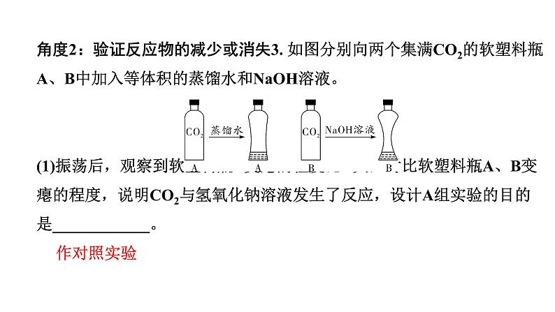 角度2:验证反应物的减少或消失3. 如图分别向两个集满CO2的软塑料瓶A、B中加入等体积的蒸馏水和NaOH溶液。(1)振荡后,观察到软塑料瓶B变瘪的程度比A大,对比软塑料瓶A、B变瘪的程度,说明CO2与氢氧化钠溶液发生了反应,设计A组实验的目的是____________。