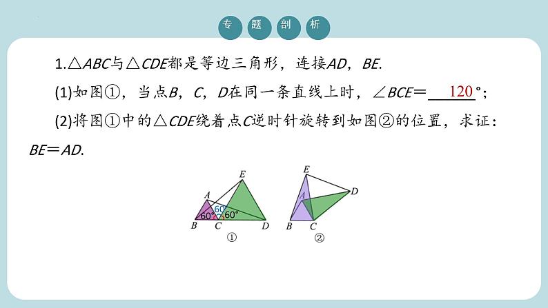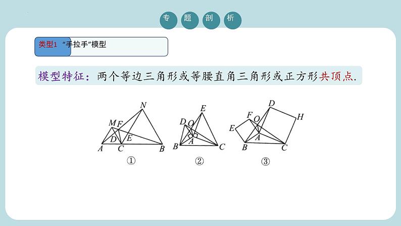 九年级上册旋转中常见的几何模型期末复习专题6 1.△ABC与△CDE都是等边三角形,连接AD,BE.(1)如图①,当点B,C,D在同一条直线上时,∠BCE=______°;(2)将图①中的△CDE绕着点C逆时针旋转到如图②的位置,求证:BE=AD.12060°60°60°∴△BCE≌△ACD(SAS),∴BE=AD.证明:∵△ABC与△CDE都是等边三角形,∴BC=AC,CE=CD,∠ACB=∠DCE=60°,∴∠ACB+∠ACE=∠DCE+∠ACE,即∠BCE=∠ACD.在△BCE和△ACD中, 相等垂直(1)中的结论仍然成立.理由如下:设AF与CD,BD分别相交于点M,H,MH O42 O42 ①等腰直角三角形含半角 结论:①DE=DF;②DE2=BD2+CE2.②正方形含半角如图,四边形ABCD为正方形,∠EAF=45°.结论:①EF=DF+BE;②△CEF的周长等于正方形周长的一半;③MN2=DM2+BN2.3.如图,在等腰直角三角形ABC中,∠BAC=90°,AB=AC,点M,N在边BC上,且∠MAN=45°,BM=1,CN=3,求MN的长.D113 4.如图,已知正方形ABCD的边长为3,E,F分别是AB,BC边上的点,且∠EDF=45°,将△DAE绕点D逆时针旋转90°得到△DCM.(1)求证:EF=MF;(2)当AE=1时,求EF的长.在△DEF和△DMF中, (1)证明:∵将△DAE绕点D逆时针旋转90°得到△DCM,∴DE=DM,∠EDM=90°.∵∠EDF=45°,∴∠MDF=45°,∴∠EDF=∠MDF.∴△DEF≌△DMF,∴EF=MF.4.如图,已知正方形ABCD的边长为3,E,F分别是AB,BC边上的点,且∠EDF=45°,将△DAE绕点D逆时针旋转90°得到△DCM.(2)当AE=1时,求EF的长.112x3-x∵EF=MF.