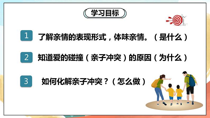 人教部编版 (五四制)六年级全册爱在家人间教课内容ppt课件: 这是一份人教部编版 (五四制)六年级全册<a href="/zz/tb_c152580_t3/?tag_id=26" target="_blank">爱在家人间教课内容ppt课件</a>,共23页。PPT课件主要包含了爱在家人间,学习目标,体味亲情,爱的碰撞,沟通传递爱,情景体验,合作探究,关注事实,把握时机,留意态度等内容,欢迎下载使用。