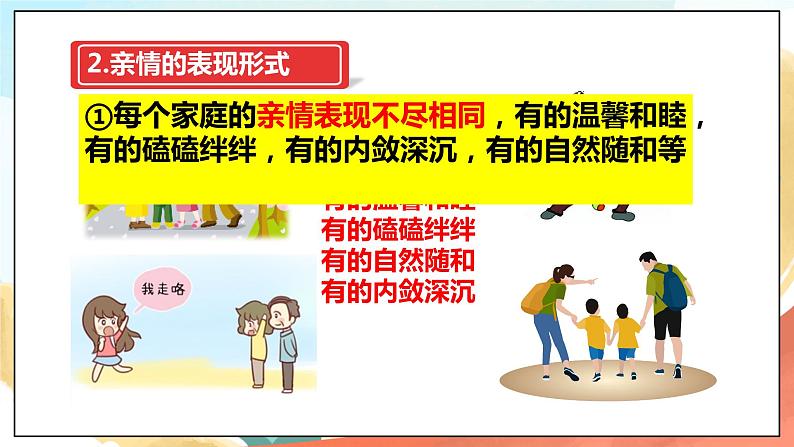 ①每个家庭的亲情表现不尽相同,有的温馨和睦,有的磕磕绊绊,有的内敛深沉,有的自然随和等②由于亲人的离开、新成员的出现,我们的家庭结构也会因之改变。但是,家中的亲情仍在。