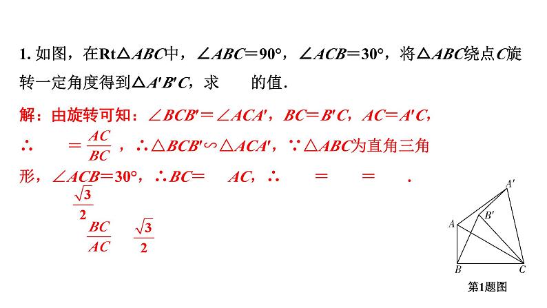 1. 如图,在Rt△ABC中,∠ABC=90°,∠ACB=30°,将△ABC绕点C旋转一定角度得到△A′B′C,求 的值.