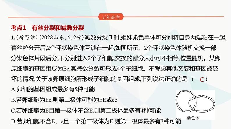1.(新思维)(2023山东,6,2分)减数分裂Ⅱ时,姐妹染色单体可分别将自身两端粘在一起, 着丝粒分开后,2个环状染色体互锁在一起,如图所示。2个环状染色体随机交换一部 分染色体片段后分开,分别进入2个子细胞,交换的部分大小可不相等,位置随机。某卵 原细胞的基因组成为Ee,其减数分裂可形成4个子细胞。不考虑其他突变和基因被破 坏的情况,关于该卵原细胞所形成子细胞的基因组成,下列说法正确的是 ( )