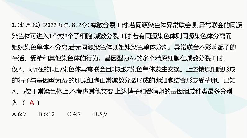 2.(新思维)(2022山东,8,2分)减数分裂Ⅰ时,若同源染色体异常联会,则异常联会的同源 染色体可进入1个或2个子细胞;减数分裂Ⅱ时,若有同源染色体则同源染色体分离而 姐妹染色单体不分离,若无同源染色体则姐妹染色单体分离。异常联会不影响配子的 存活、受精和其他染色体的行为。基因型为Aa的多个精原细胞在减数分裂Ⅰ时, 仅A、a所在的同源染色体异常联会且非姐妹染色单体发生交换。上述精原细胞形成 的精子与基因型为Aa的卵原细胞正常减数分裂形成的卵细胞结合形成受精卵。已知 A、a位于常染色体上,不考虑其他突变,上述精子和受精卵的基因组成种类最多分别 为 ( )A.6;9 B.6;12 C.4;7 D.5;9