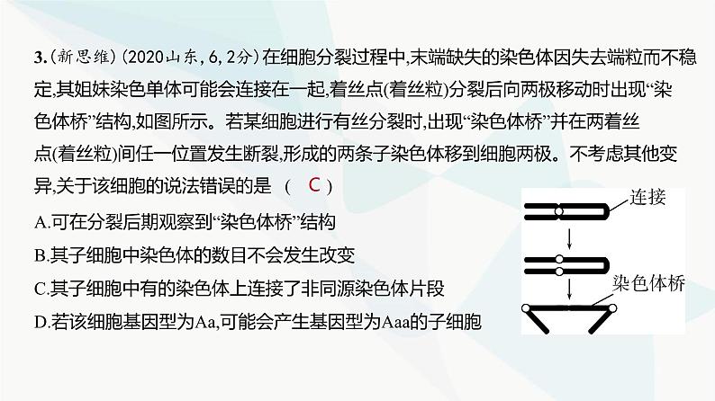 3.(新思维)(2020山东,6,2分)在细胞分裂过程中,末端缺失的染色体因失去端粒而不稳 定,其姐妹染色单体可能会连接在一起,着丝点(着丝粒)分裂后向两极移动时出现“染 色体桥”结构,如图所示。若某细胞进行有丝分裂时,出现“染色体桥”并在两着丝 点(着丝粒)间任一位置发生断裂,形成的两条子染色体移到细胞两极。不考虑其他变 异,关于该细胞的说法错误的是 ( )