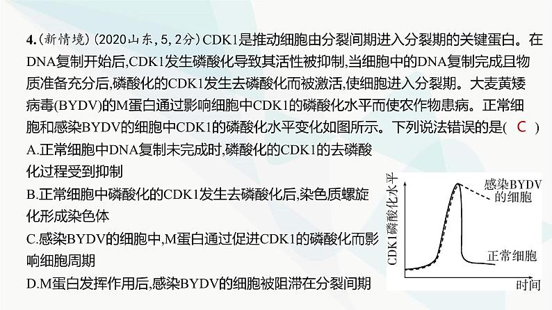 4.(新情境)(2020山东,5,2分)CDK1是推动细胞由分裂间期进入分裂期的关键蛋白。在 DNA复制开始后,CDK1发生磷酸化导致其活性被抑制,当细胞中的DNA复制完成且物 质准备充分后,磷酸化的CDK1发生去磷酸化而被激活,使细胞进入分裂期。大麦黄矮 病毒(BYDV)的M蛋白通过影响细胞中CDK1的磷酸化水平而使农作物患病。正常细 胞和感染BYDV的细胞中CDK1的磷酸化水平变化如图所示。下列说法错误的是( )