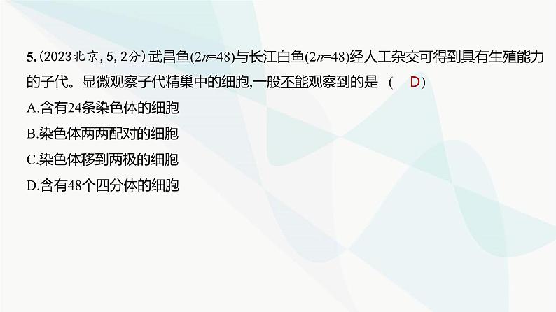 5.(2023北京,5,2分)武昌鱼(2n=48)与长江白鱼(2n=48)经人工杂交可得到具有生殖能力 的子代。显微观察子代精巢中的细胞,一般不能观察到的是 ( )A.含有24条染色体的细胞 B.染色体两两配对的细胞C.染色体移到两极的细胞 D.含有48个四分体的细胞
