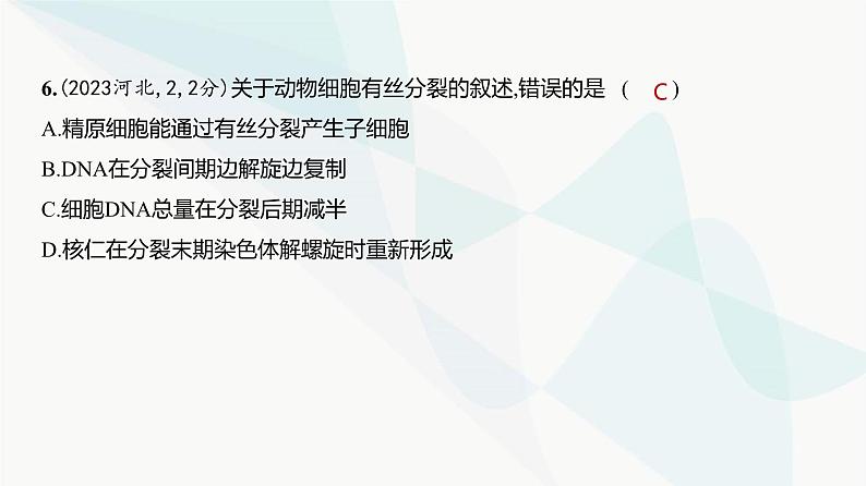 6.(2023河北,2,2分)关于动物细胞有丝分裂的叙述,错误的是 ( )A.精原细胞能通过有丝分裂产生子细胞B.DNA在分裂间期边解旋边复制C.细胞DNA总量在分裂后期减半D.核仁在分裂末期染色体解螺旋时重新形成