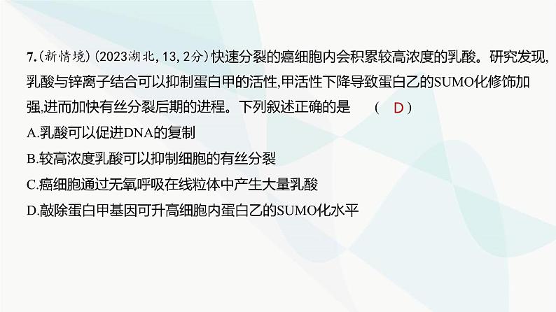 7.(新情境)(2023湖北,13,2分)快速分裂的癌细胞内会积累较高浓度的乳酸。研究发现, 乳酸与锌离子结合可以抑制蛋白甲的活性,甲活性下降导致蛋白乙的SUMO化修饰加 强,进而加快有丝分裂后期的进程。下列叙述正确的是 ( )A.乳酸可以促进DNA的复制B.较高浓度乳酸可以抑制细胞的有丝分裂C.癌细胞通过无氧呼吸在线粒体中产生大量乳酸D.敲除蛋白甲基因可升高细胞内蛋白乙的SUMO化水平