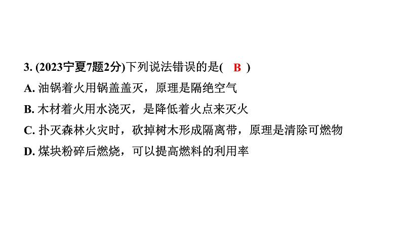 3. (2023宁夏7题2分)下列说法错误的是( )A. 油锅着火用锅盖盖灭,原理是隔绝空气B. 木材着火用水浇灭,是降低着火点来灭火C. 扑灭森林火灾时,砍掉树木形成隔离带,原理是清除可燃物D. 煤块粉碎后燃烧,可以提高燃料的利用率