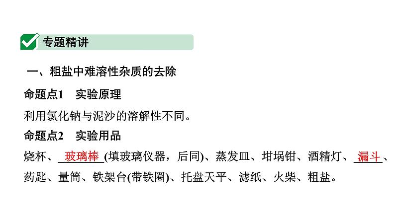 命题点1 实验原理利用氯化钠与泥沙的溶解性不同。命题点2 实验用品烧杯、________(填玻璃仪器,后同)、蒸发皿、坩埚钳、酒精灯、_____、药匙、量筒、铁架台(带铁圈)、托盘天平、滤纸、火柴、粗盐。