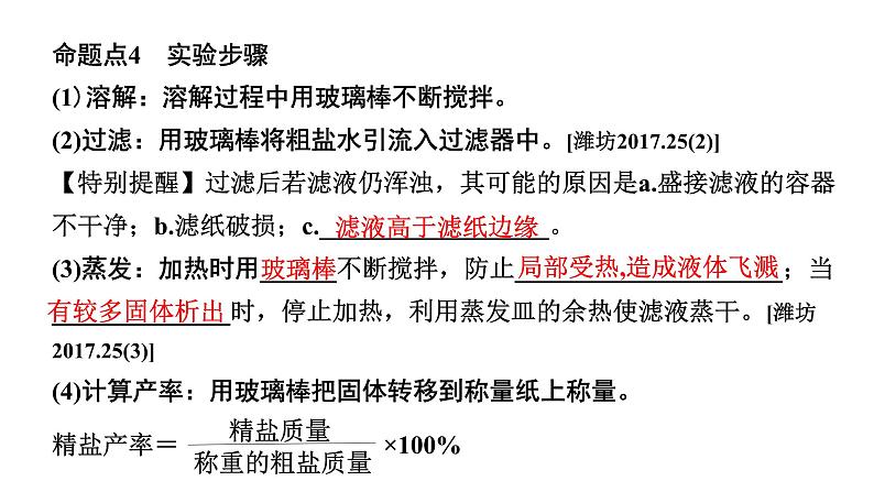 命题点4 实验步骤(1)溶解:溶解过程中用玻璃棒不断搅拌。(2)过滤:用玻璃棒将粗盐水引流入过滤器中。[潍坊2017.25(2)]【特别提醒】过滤后若滤液仍浑浊,其可能的原因是a.盛接滤液的容器不干净;b.滤纸破损;c.__________________。(3)蒸发:加热时用______不断搅拌,防止_____________________;当______________时,停止加热,利用蒸发皿的余热使滤液蒸干。[潍坊2017.25(3)](4)计算产率:用玻璃棒把固体转移到称量纸上称量。精盐产率= ×100%
