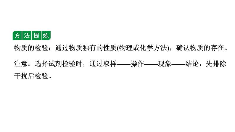 物质的检验:通过物质独有的性质(物理或化学方法),确认物质的存在。注意:选择试剂检验时,通过取样——操作——现象——结论,先排除干扰后检验。