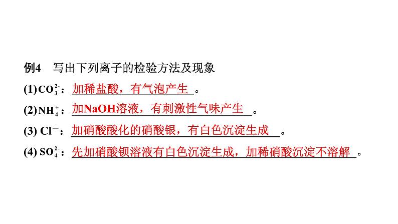 一、物质的检验例1 写出检验下列气体的方法及现象。(1)O2:_____________________________________。(2)CO2:_________________________________________。(3)H2、CO、CH4:点燃气体,将干冷的烧杯罩在火焰上方,然后把烧杯迅速翻转过来,加入少量澄清石灰水,振荡,①观察到_______________________________________,该气体为H2;②观察到_____________________________________,该气体为CO;③观察到_____________________________________,该气体为CH4。(4)水蒸气:_________________________________。