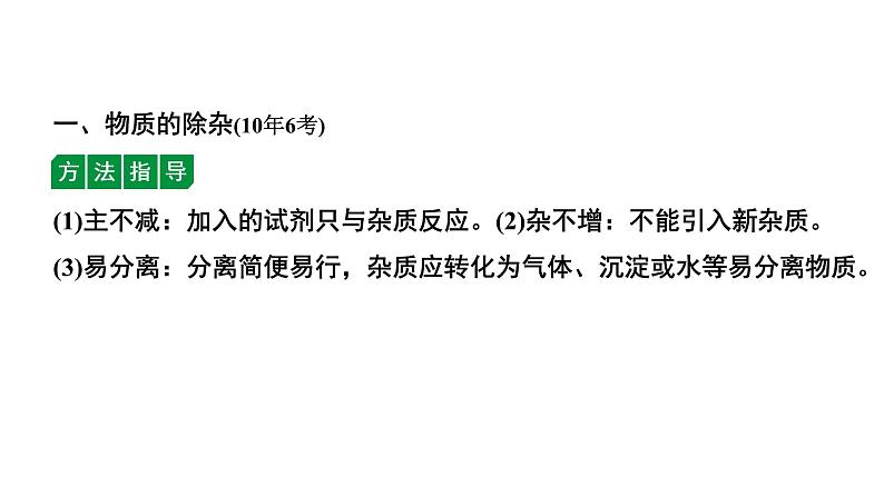 (1)主不减:加入的试剂只与杂质反应。(2)杂不增:不能引入新杂质。(3)易分离:分离简便易行,杂质应转化为气体、沉淀或水等易分离物质。