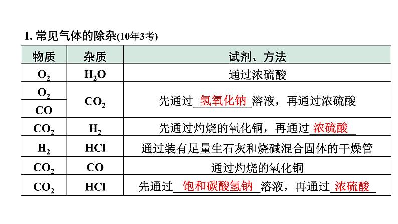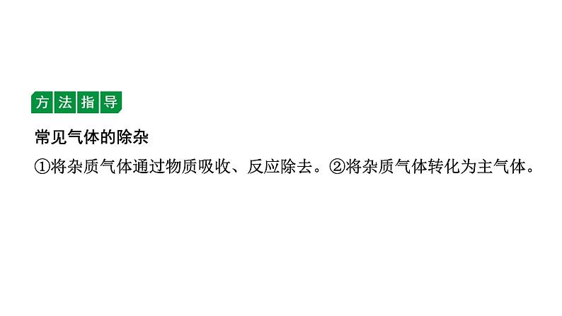 常见气体的除杂①将杂质气体通过物质吸收、反应除去。②将杂质气体转化为主气体。