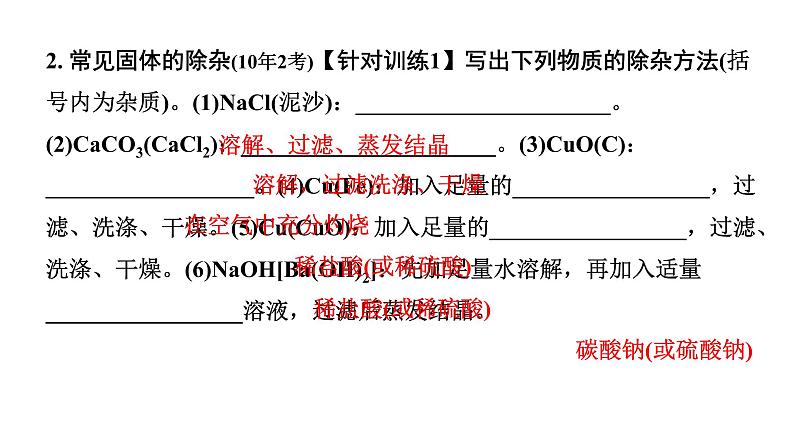 2. 常见固体的除杂(10年2考)【针对训练1】写出下列物质的除杂方法(括号内为杂质)。(1)NaCl(泥沙):______________________。(2)CaCO3(CaCl2):______________________。(3)CuO(C):__________________。(4)Cu(Fe):加入足量的_________________,过滤、洗涤、干燥。(5)Cu(CuO):加入足量的_________________,过滤、洗涤、干燥。(6)NaOH[Ba(OH)2]:先加足量水溶解,再加入适量_________________溶液,过滤后蒸发结晶。