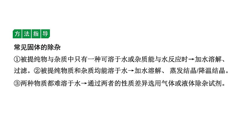 常见固体的除杂①被提纯物与杂质中只有一种可溶于水或杂质能与水反应时→加水溶解、过滤。②被提纯物质和杂质均能溶于水→加水溶解、 蒸发结晶/降温结晶。③两种物质都难溶于水→通过两者的性质差异选用气体或液体除杂试剂。