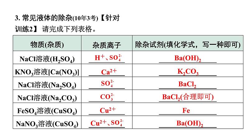 3. 常见液体的除杂(10年3考)【针对训练2】 请完成下列表格。