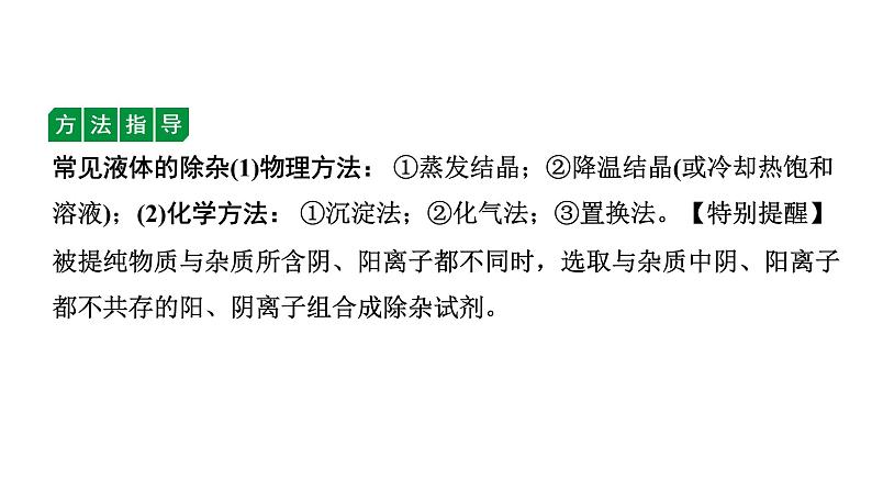 常见液体的除杂(1)物理方法: ①蒸发结晶;②降温结晶(或冷却热饱和溶液);(2)化学方法: ①沉淀法;②化气法;③置换法。【特别提醒】被提纯物质与杂质所含阴、阳离子都不同时,选取与杂质中阴、阳离子都不共存的阳、阴离子组合成除杂试剂。