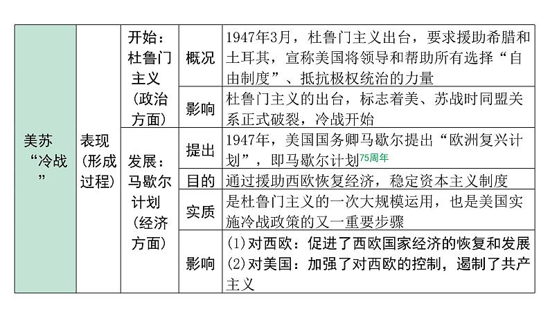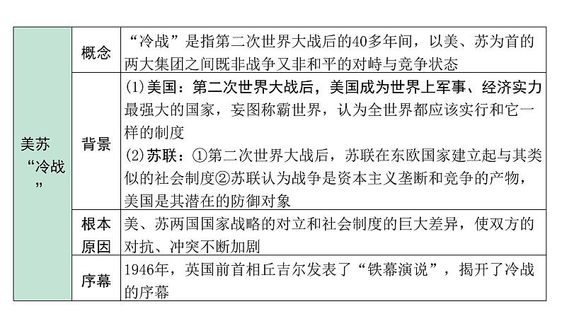 这是一份2024内蒙古中考历史二轮中考题型研究 世界现代史 二战后的世界变化(课件),共31页。PPT课件主要包含了美苏冷战,年3月,世纪50年代,世纪80年代后期,杜鲁门主义出台,万隆会议,“非洲年”,纳米比亚独立,社会主义的发展与挫折,马歇尔计划提出等内容,欢迎下载使用。