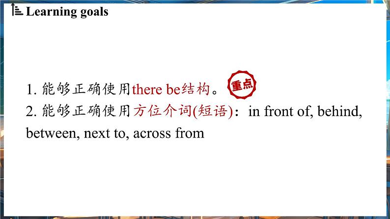 1. there be结构的用法2. 方位介词(短语):in frnt f, behind, between, next t, acrss frm