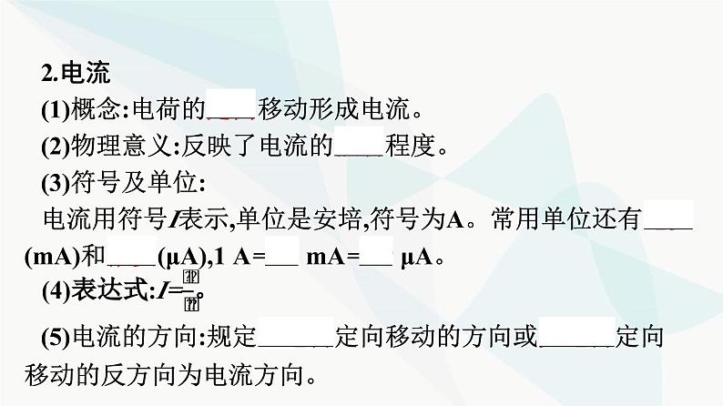 2.电流的方向规定正电荷定向移动的方向为电流的方向,则负电荷定向移动的方向与电流的方向相反,金属导体中自由移动的电荷是自由电子,故电流的方向与自由电子定向移动的方向相反。