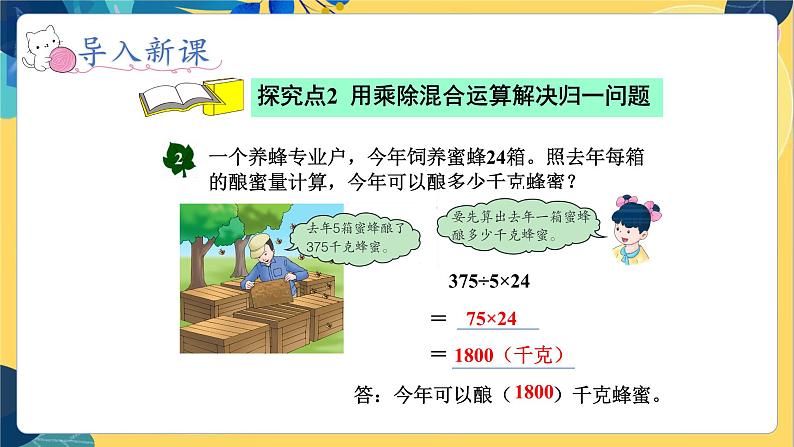 这是一份数学冀教版三 解决问题课堂教学ppt课件,共15页。PPT课件主要包含了新课导入,先算什么再算什么,原计划,÷5×24,=75×24,=1800千克,÷3×6,×28÷7,×18÷6,=87×6等内容,欢迎下载使用。