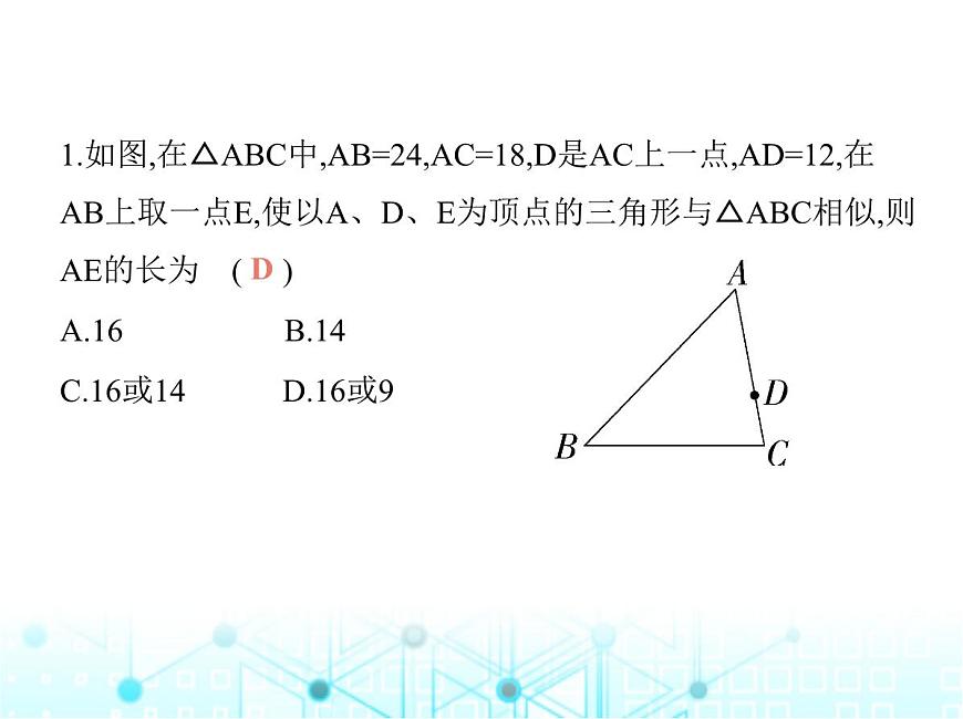解析 本题分两种情况:①如图1,当△ADE∽△ACB时, = ,∵AB=24,AC=18,AD=12,∴AE=16;②如图2,当△ADE∽△ABC时, = ,∵AB=24,AC=18,AD=12,∴AE=9.故选D. 图1 图2