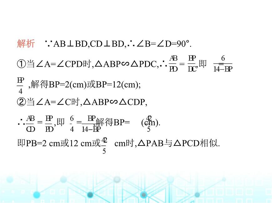 解析 ∵AB⊥BD,CD⊥BD,∴∠B=∠D=90°.①当∠A=∠CPD时,△ABP∽△PDC,∴ = ,即 = ,解得BP=2(cm)或BP=12(cm);②当∠A=∠C时,△ABP∽△CDP,∴ = ,即 = ,解得BP= (cm).即PB=2 cm或12 cm或 cm时,△PAB与△PCD相似.