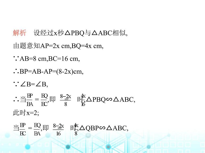 解析 设经过x秒△PBQ与△ABC相似,由题意知AP=2x cm,BQ=4x cm,∵AB=8 cm,BC=16 cm,∴BP=AB-AP=(8-2x)cm,∵∠B=∠B,∴当 = ,即 = 时,△PBQ∽△ABC,此时x=2;当 = ,即 = 时,△QBP∽△ABC,