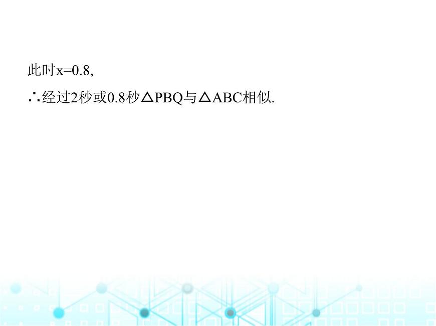 此时x=0.8,∴经过2秒或0.8秒△PBQ与△ABC相似.